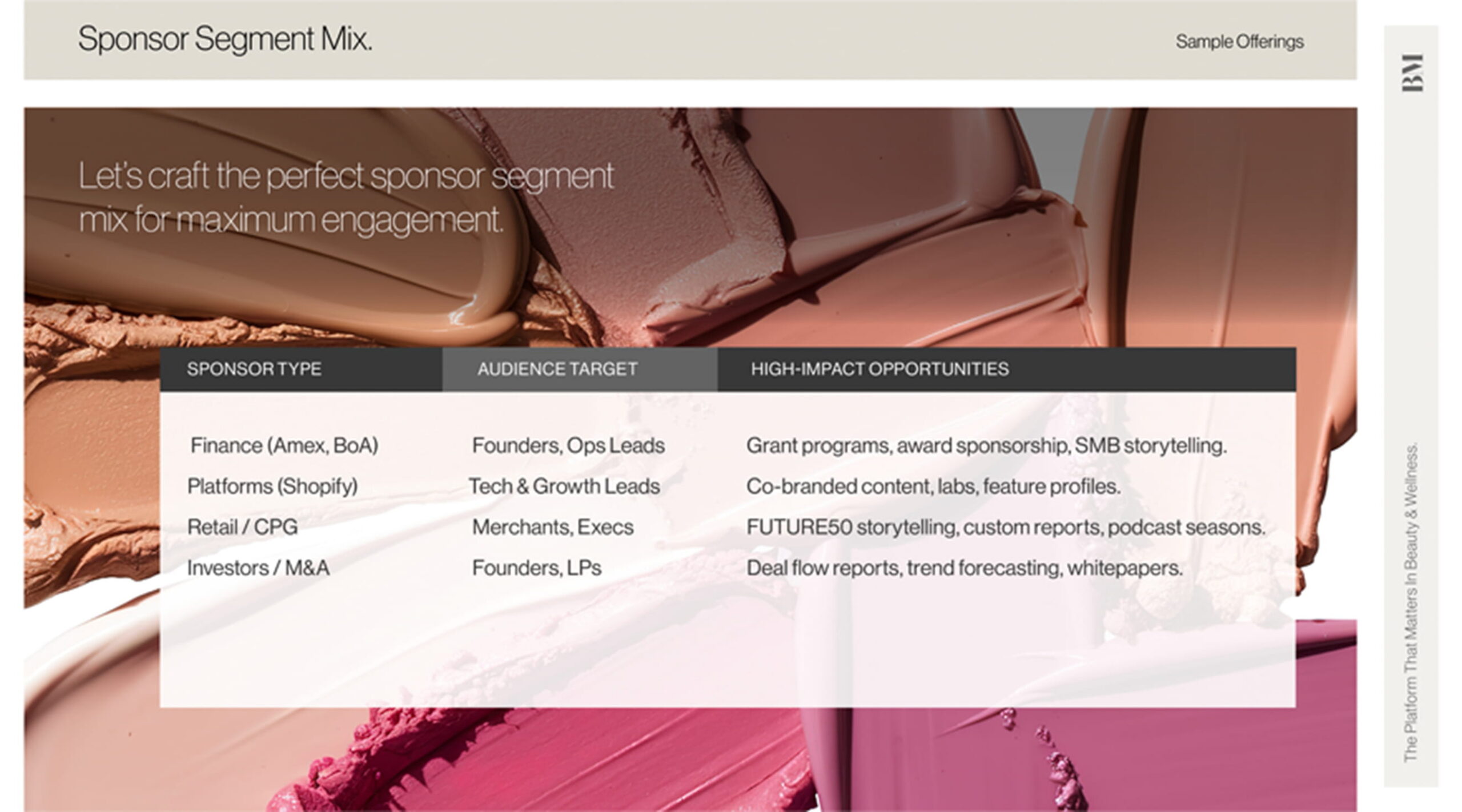 The BeautyMatter media kit introduces the brand through a sophisticated, modern design system that conveys its authority through audience reach, demographics, and key industry partnerships, with all content developed by Tina Hedges.
