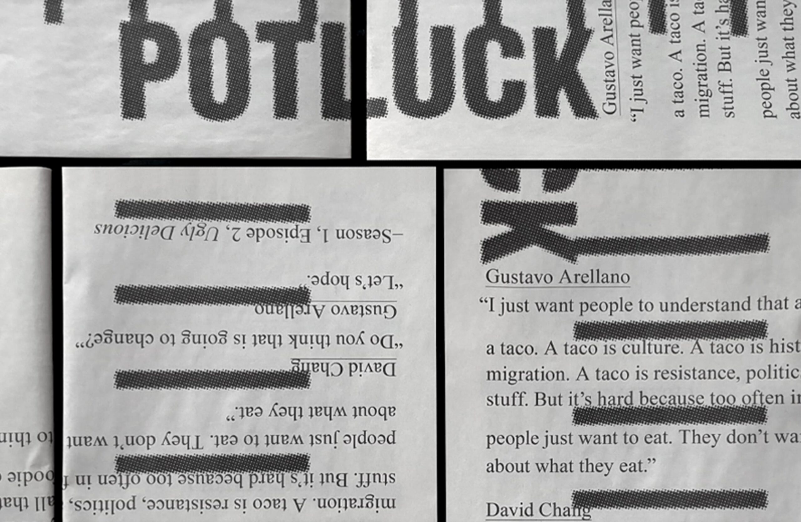 The exhibition poster, printed on newsprint, nods to the common practice of wrapping fried food in the substrate.