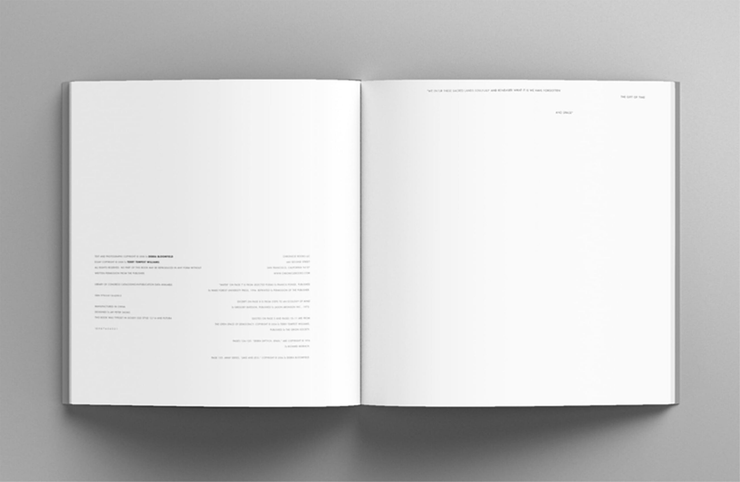 Still, includes an artist statement from Bloomfield; essays titled “Still,” “Ground Truthing,” and “Open Space of Democracy” by Terry Tempest Williams, an American writer, educator, and conservationist; Selected Poems by Francis Ponge; “Suitcase of Memory,” a conversation between Bloomfield and Corey Keller, an independent photo historian and curator; and an excerpt from Gregory Bateson’s essay “Steps to an Ecology.”
